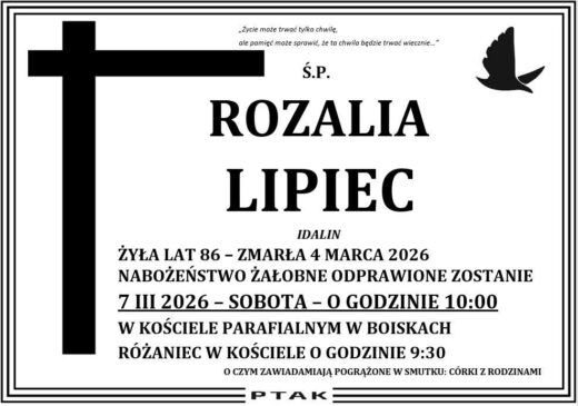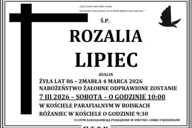 Zmarła śp. Rozalia Lipiec. Pogrzeb odbędzie się 7 marca (sobota) o godz. 10.00. Różaniec w intencji zmarłej o godz. 9.30. Następnie ciało zmarłej zostanie złożone na cmentarzu parafialnym w Boiskach. Polecajmy w naszych modlitwach miłosiernemuContinue reading