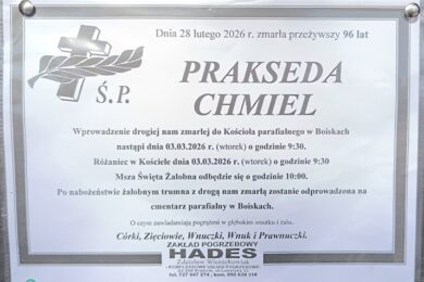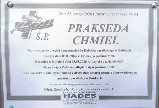 Zmarła śp. Prakseda Chmiel. Pogrzeb odbędzie się 3 marca (wtorek) o godz. 10.00. Różaniec w intencji zmarłej o godz. 9.30. Następnie ciało zmarłej zostanie złożone na cmentarzu parafialnym w Boiskach. Polecajmy w naszych modlitwach miłosiernemuContinue reading
