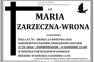 Zmarła śp. Maria Zarzeczna-Wrona. Msza Święta pogrzebowa odbędzie się 27 kwietnia (poniedziałek) o godz. 12.00. Różaniec w intencji zmarłej rozpocznie się o godz. 11.30. Następnie ciało zmarłej zostanie złożone na cmentarzu parafialnym w Boiskach. PolecajmyContinue reading