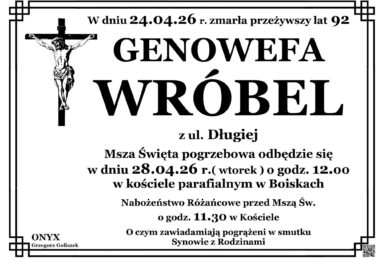 Zmarła śp. Genowefa Wróbel. Msza Święta pogrzebowa odbędzie się 28 kwietnia (wtorek) o godz. 12.00. Różaniec w intencji zmarłej rozpocznie się o godz. 11.30. Następnie ciało zmarłej zostanie złożone na cmentarzu parafialnym w Boiskach. PolecajmyContinue reading