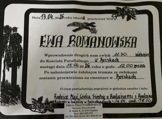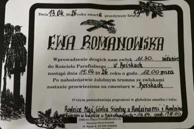 Zmarła śp. Ewa Romanowska. Msza Święta pogrzebowa odbędzie się 15 kwietnia (środa) o godz. 12.00. Różaniec w intencji zmarłej rozpocznie się o godz. 11.30. Następnie ciało zmarłej zostanie złożone na cmentarzu parafialnym w Boiskach. PolecajmyContinue reading