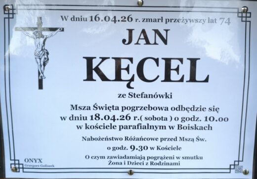 Zmarł śp. Jan Kęcel. Msza Święta pogrzebowa odbędzie się 18 kwietnia (sobota) o godz. 10.00. Różaniec w intencji zmarłego rozpocznie się o godz. 9.30. Następnie ciało zmarłego zostanie złożone na cmentarzu parafialnym w Boiskach. PolecajmyContinue reading