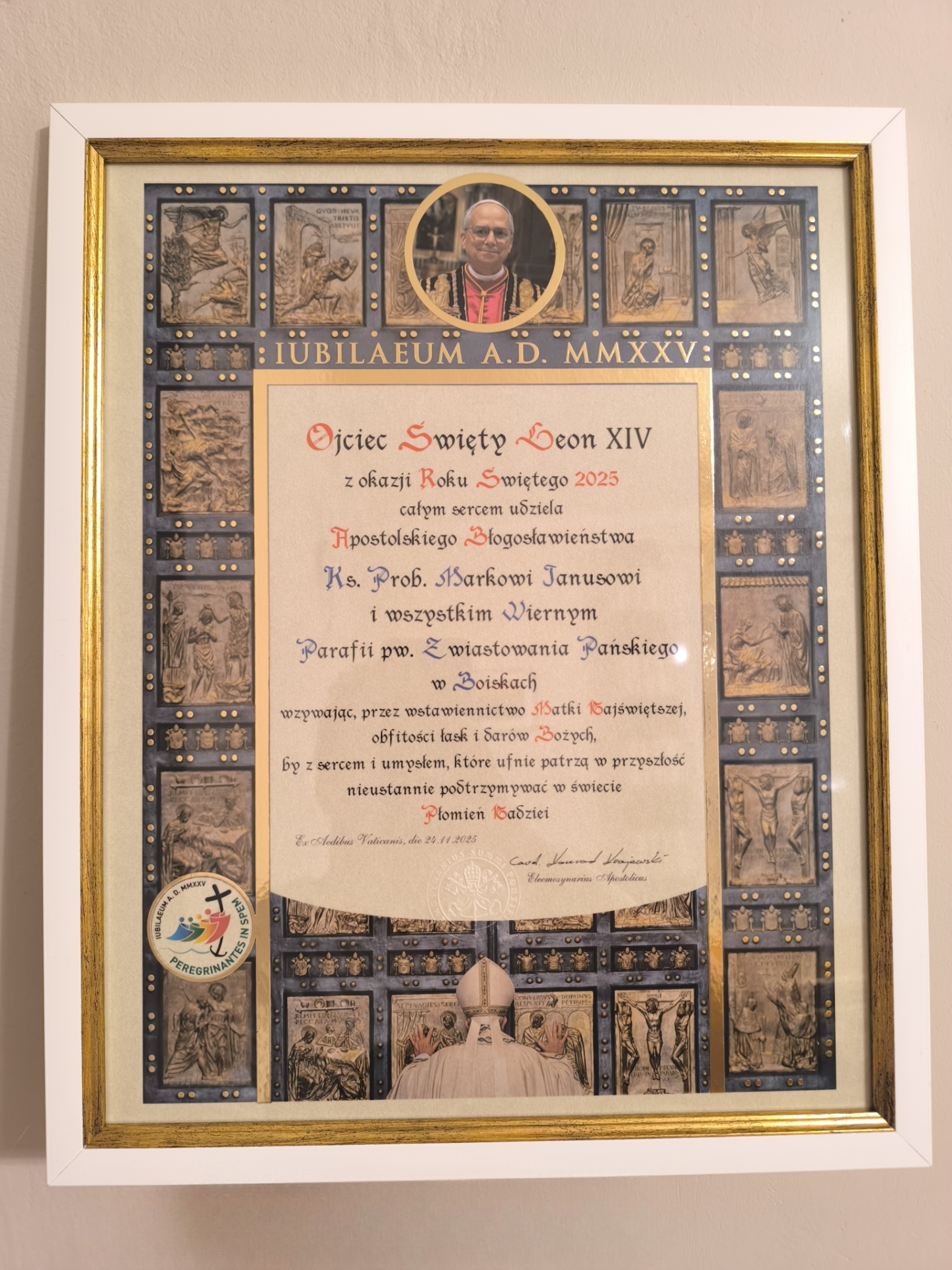 Ojciec Święty, całym sercem, udziela apostolskiego błogosławieństwa Księdzu Proboszczowi Markowi Janusowi oraz wszystkim Parafianom, wzywając przez wstawiennictwo Najświętszej Maryi Panny obfitości łask i darów Bożych. Błogosławieństwo to jest znakiem duchowej jedności Kościoła oraz umocnieniem wiary wspólnoty parafialnej w przeżywanym Roku Jubileuszowym.