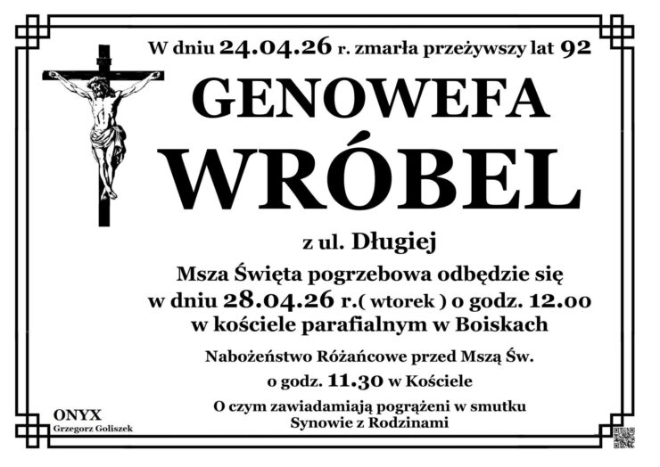 Msza Święta pogrzebowa odbędzie się 28 kwietnia (wtorek) o godz. 12.00. Różaniec w intencji zmarłej rozpocznie się o godz. 11.30. Następnie ciało zmarłej zostanie złożone na cmentarzu parafialnym w Boiskach.